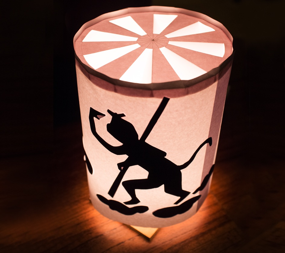 - Dùng cúc bấm dán vào tâm của miếng bìa hình tròn để làm trục quay cho đèn, cắt 2 vòng xoay có đường kính 17 cm, trên đó cắt những hình tùy ý (các con vật, các nhân vật, cỏ cây, hoa lá). Đây chính là những hình trang trí sẽ xuất hiện và quay vòng khi đốt nến.